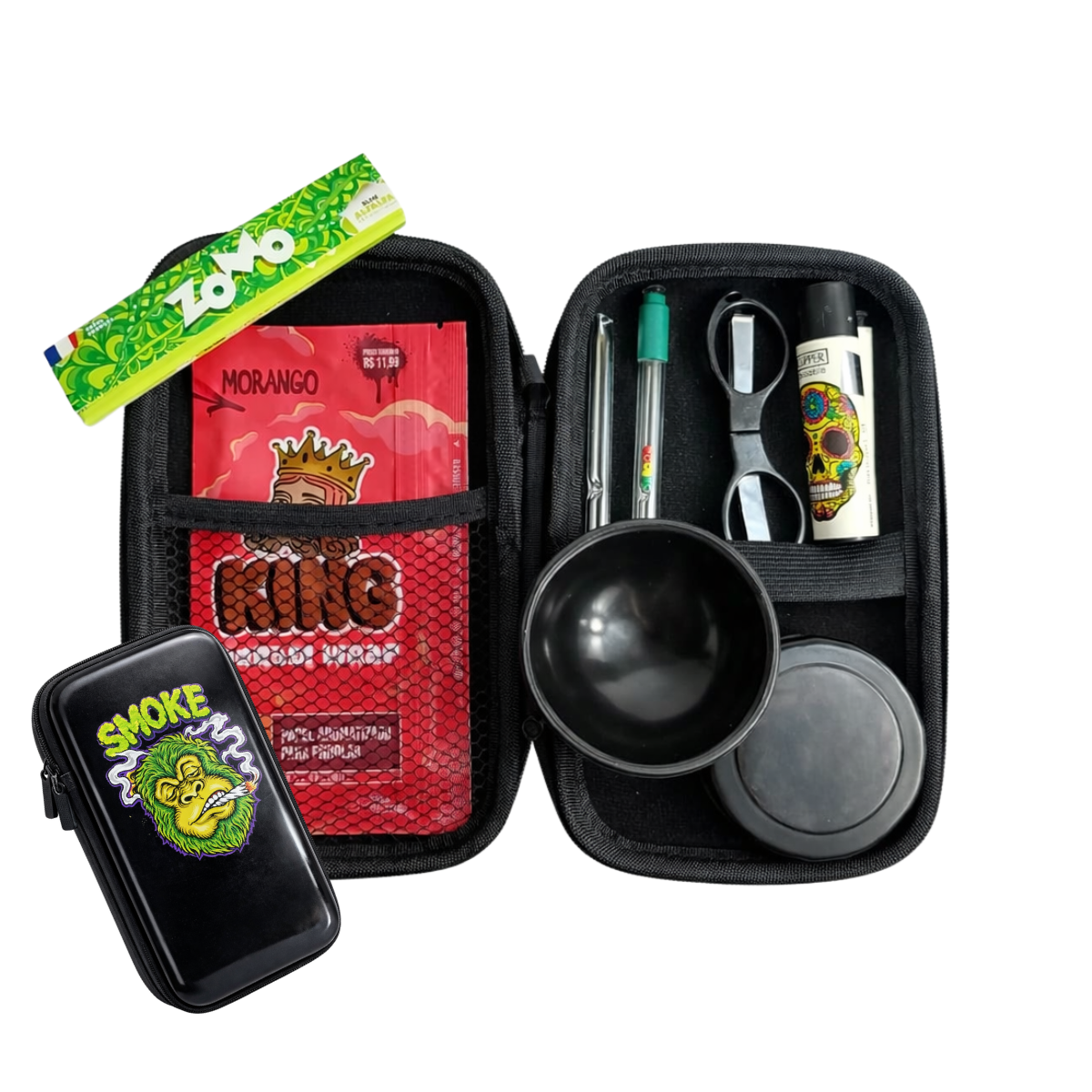 O kit é composto por 1 case com estampa de alien, 1 piteira, 1 seda, 1 cuia, 1 tesoura, 1 blunt e acessórios complementares, totalizando 9 unidades.